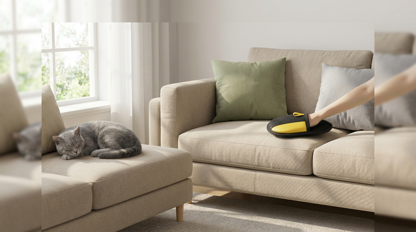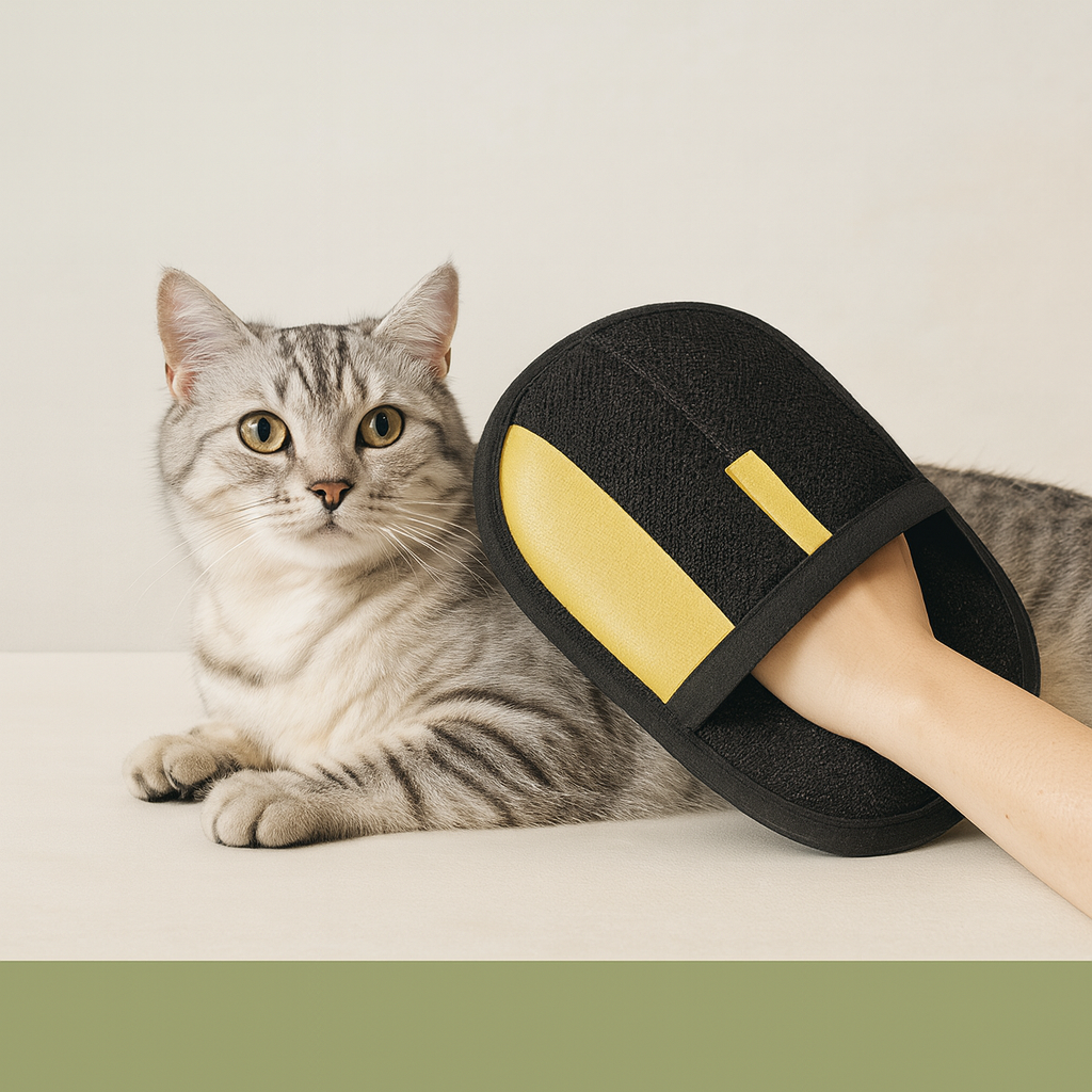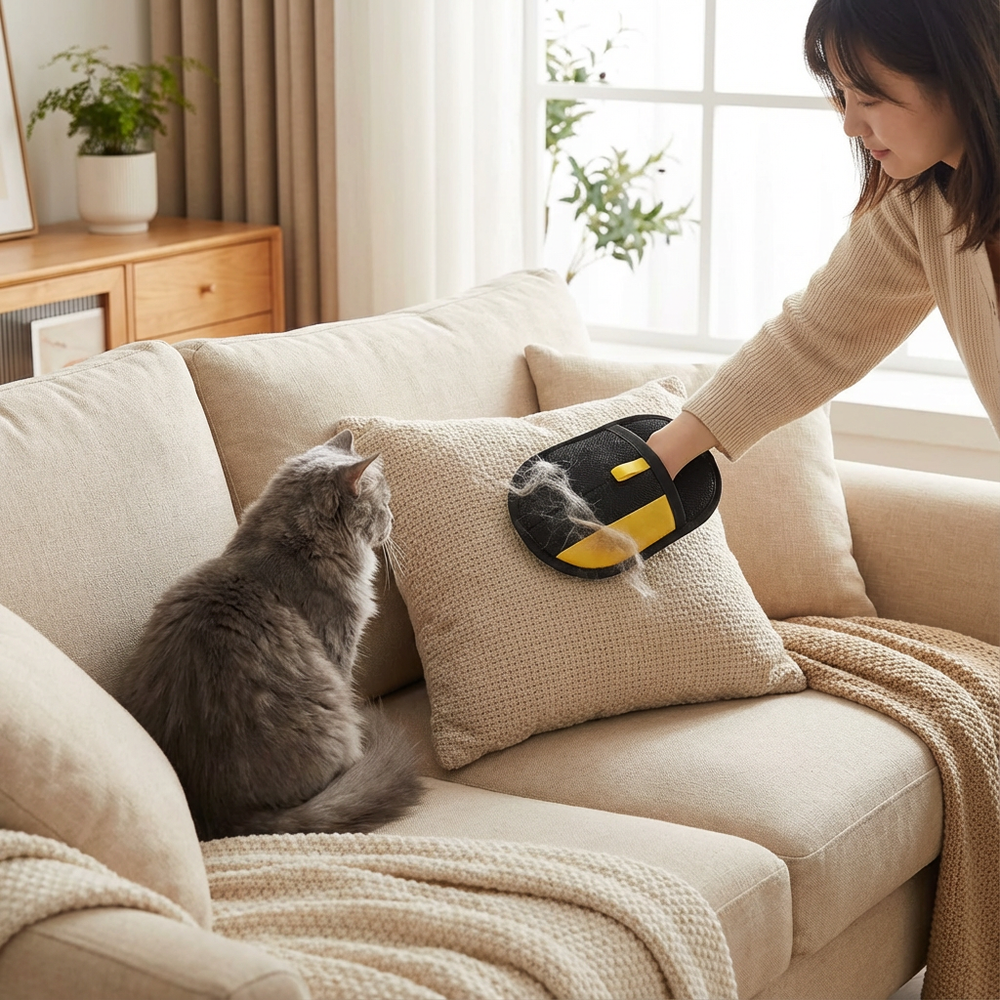 The reusable pet hair removal glove that catches the bulk of fur on beds, sofas, and couch covers—no sticky sheets, no stress.